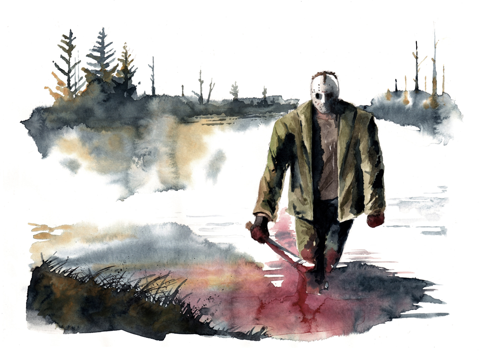 Watercolor painting of Jason Vorhees exiting Crystal Lake